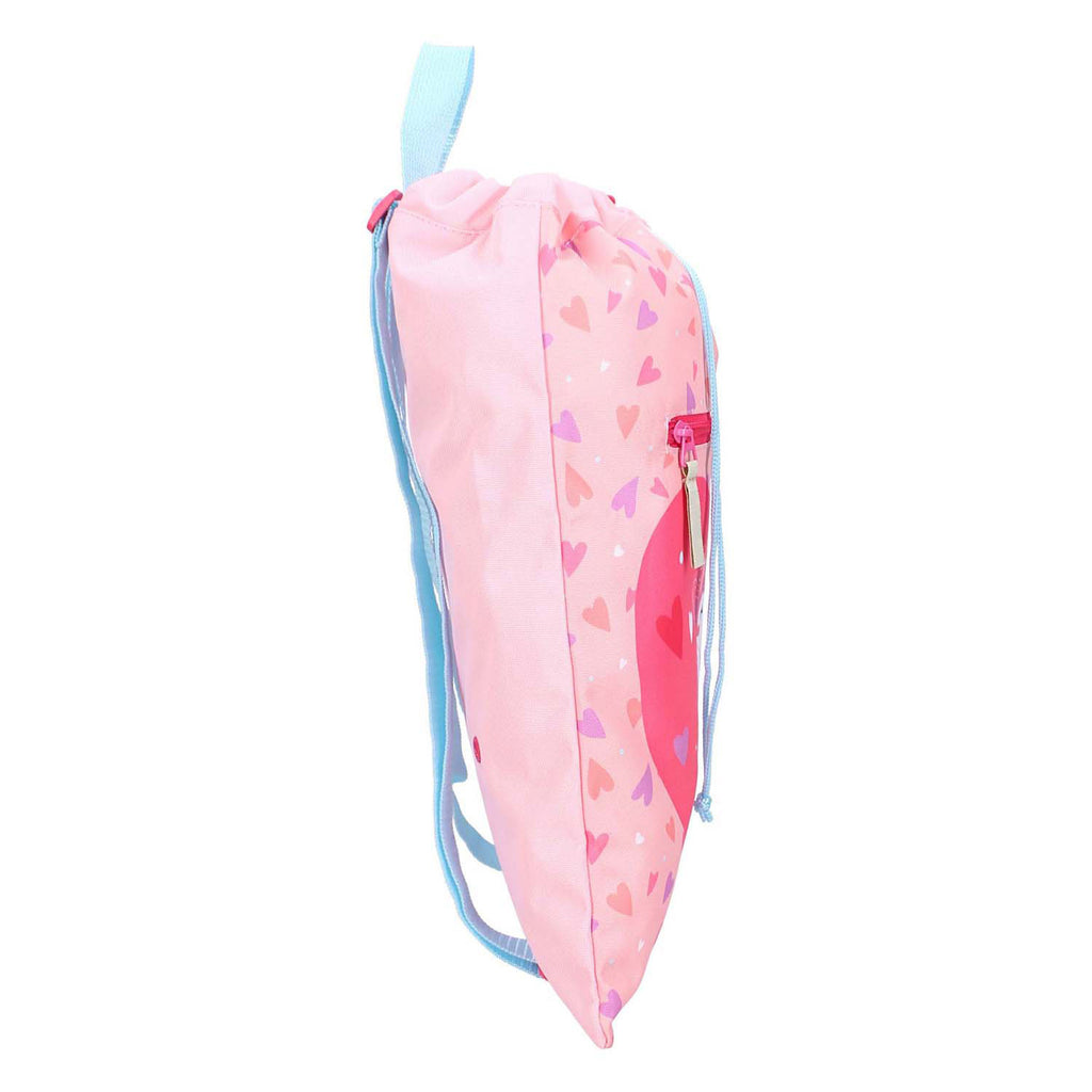 Raak geïnspireerd door deze leuke gymtas van Prêt uit de 'Happy Go Lucky' collectie. Deze roze gymtas is een ideaal item om mee te nemen naar de gym- of zwemles. De roze gymtas is voorzien van een all-over print met hartjes en er staat een prachtige eenhoorn op afgebeeld. De gymtas heeft een treksluiting met touwtjes en verstelbare schouderbanden. Ook heeft de tas een superhandig voorvak met ritssluiting voor kleine spullen, zoals sleutels, elastiekjes of een portemonnee. Met de verstelbare schouderbanden is deze tas voor iedereen op maat te maken. Zo kunnen de kleinste kinderen al genieten van deze leuke gymtas!