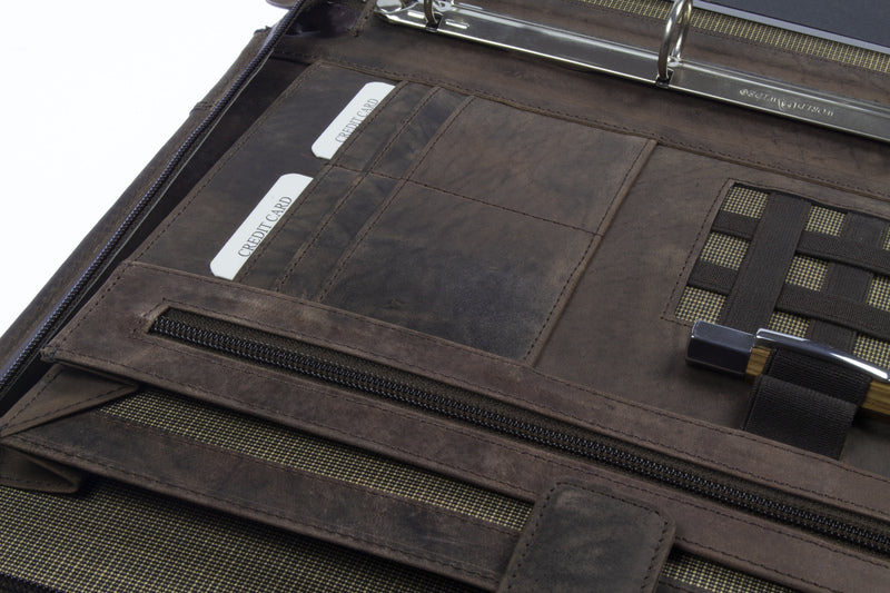 Conferentie Schrijfmap VIGGO Pride and Soul. Incl schrijfblok, diverse opbergmogelijkheden. Gewatteerd tabletvak, vak met rits, 2 pennenlusen, vier kredietkaartgleuven, twee elastieken lussen. Bruin leer. Buitenmaat ca. 35.5 x 28 x 5 cm.