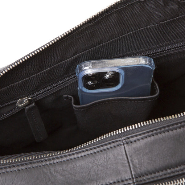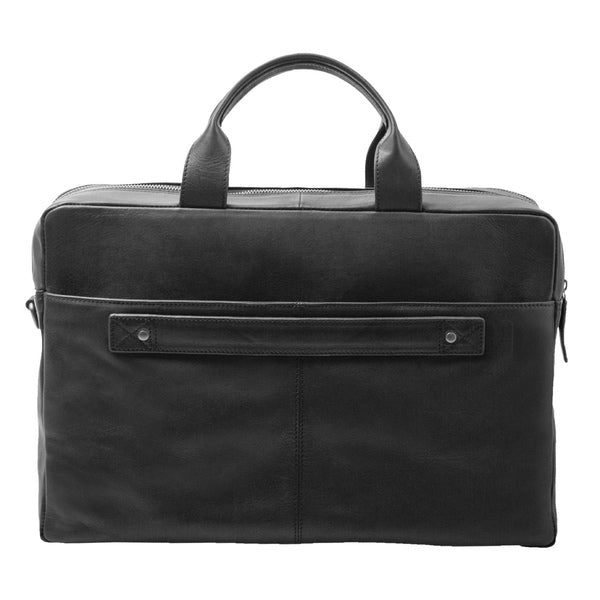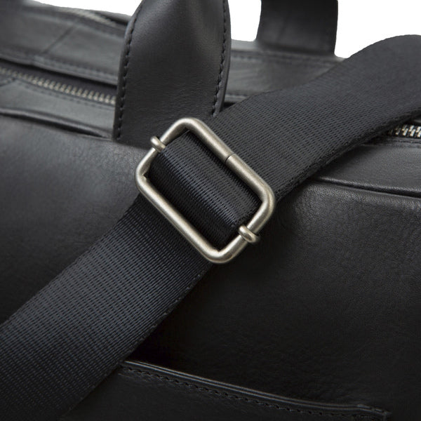 Aktetas Pride and Soul NOMAD.zwart leer met verstelbare, afneembare schouderriem, twee draagriemen, vak met ritssluiting voor en achter, trolleyriem. Binnen: hoofdvak met gewatteerd laptopvak, extra hoofdvak met telefoonhoesje en ritsvak. Binnenmaat 28x37x4cm