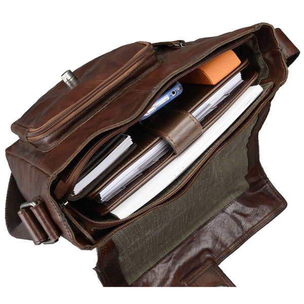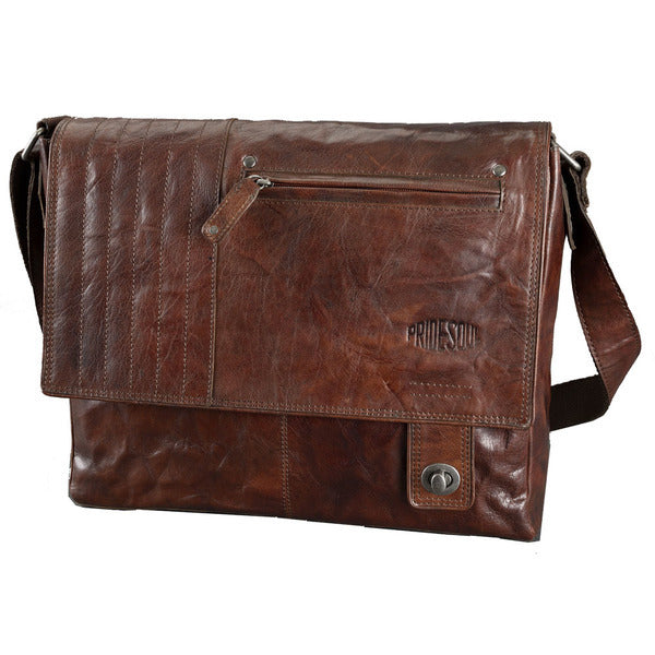 Pride and Soul leren schoudertasmet aanpasbare schouderriem en handvat, flap met métalen draaislot, ritssluiting, twee compartimenten een open en één met rits vooraan onder de flap en een compartiment met rits aan de achterzijde. Binnenin: hoofdvak, vak voor smartphone, compartiment met rits en twee pennenhouders. Voering met geruit patroon. Kleur bruin. Afmeting: 32 x 40 x 11 cm.