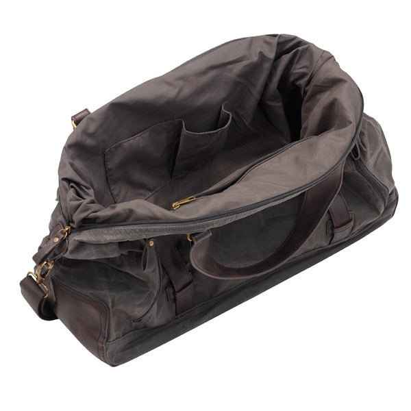 Pride and Soul weekendtas met twee handvaten, afneembare schouderriem, twee opbergvakken met rits op de rug, ruim hoofdcompartiment; Binnenin twee opbergvakken en een opbergvak met rits. Kleur grijs-bruin. Afmeting: 38,5 x 56 x 22 cm. Materiaal canvas/imitatieleer.