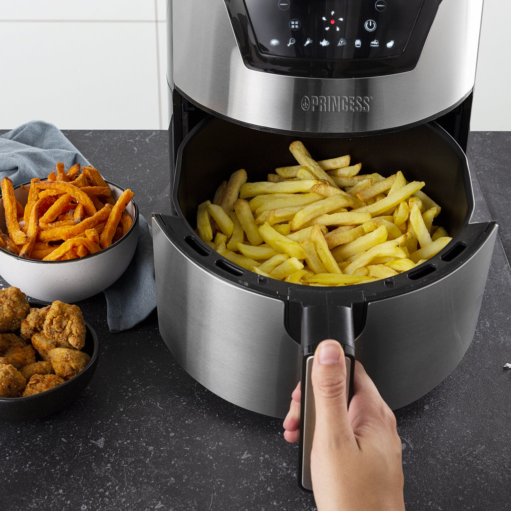 Voorzie je hele familie tegelijkertijd van heerlijke frietjes of bereid een hele maaltijd ineens in de Princess 182026 Digitale Aerofryer XXL met een grote inhoud van 4.5 liter. De snelle luchtconvectie zorgt ervoor dat je gezond kunt frituren zonder het gebruik van olie en toch een heerlijk krokant resultaat krijgt. Dankzij het digitale display en de voorgeprogrammeerde programma's is eten bereiden in de Aerofryer XXL snel en makkelijk. De ideale Aerofryer voor de drukke avonden wanneer je toch iets gezonds op tafel wilt zetten.