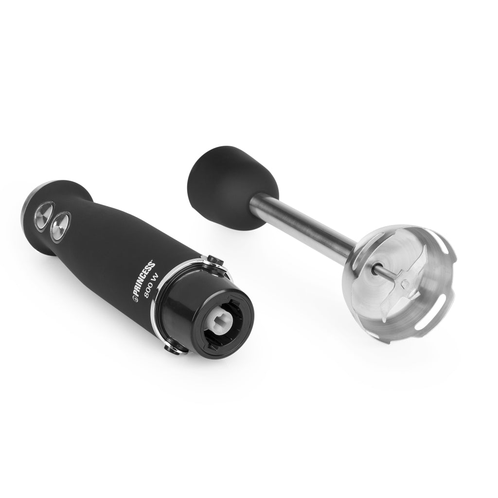 Een krachtige staafmixerset met een hoogwaardig zwart design. Maak in een handomdraai pesto, gladde soepen of fijngepureerd eten voor je kleintje. Met de bijgeleverde accessoireset met een hakmolen, klopper en beker is deze staafmixer een echte alleskunner in je keuken. Het rubberen handvat met daarin de twee verlichte instellingsknoppen ligt ergonomisch zeer goed in één hand. Daarnaast is de snelheid makkelijk af te lezen door de blauwe indicatielampjes bovenop het handvat. Het bedienen van een staafmixer was zelden zo eenvoudig. De Princess Staafmixer heeft een verwijderbare roestvrijstalen staafmixer met vier messen en pureert soepen en fruithapjes zeer glad dankzij het vermogen van 800 Watt. Bij de staafmixer ontvang je ook een maatbeker waarin je mayonaise, pesto en fruithapjes kan maken, een klopper voor slagroom en een hakmolen voor het fijnsnijden van kruiden. De staafmixer kan makkelijk uit elkaar gehaald worden en het pureergedeelte en alle accessoires kunnen in de vaatwasser. Schoonmaken is dus snel gedaan. Op alle producten van Princess ontvang je 24 maanden garantie