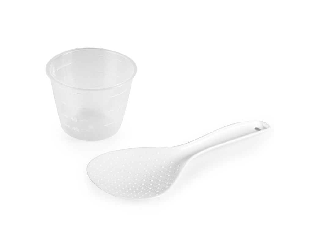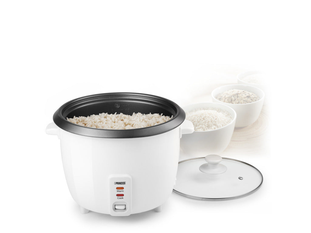 Volautomatische rijstkoker voor alle soorten rijst. Met uitneembare binnenpan met antiaanbaklaag en glazen deksel. Met maatbeker, maatschep, indicatielampje en keuzeschakelaar voor rijst koken of warm houden. Zodra de rijst gereed is schakelt de pan automatisch over op warmhouden.