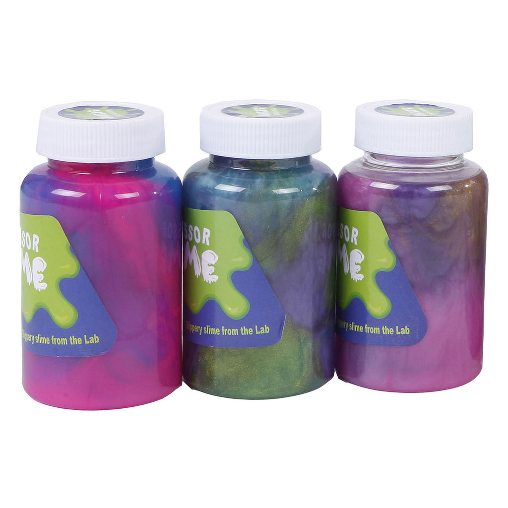 Professor Slime potje met draaideksel met daarin 250 gram multicolor slijm. Afmetingen: 10,8 centimeter. Niet geschikt voor kinderen jonger dan 3 jaar.