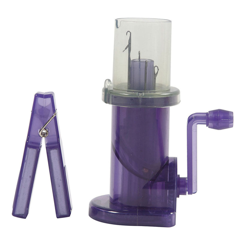 Praktische, semi-automatisch punnikgereedschap met handslinger voor eenvoudige vervaardiging van gebreide buizen. We raden 'licht' garen (Baby garen) voor haaknaald 2.5-3.5 aan. Inhoud: semi-automatische punnikmolen en geleider