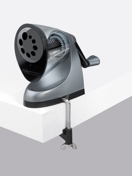 Puntenslijper inclusief tafelklem. Voor 8 verschillende formaten grafiet en kleurpotloden tussen de 7 tot 12 mm. potloodpunt formaat is verstelbaar. Afmetingen 13,1 x 7,4 x 13,1cm. Met titanium mesjes.