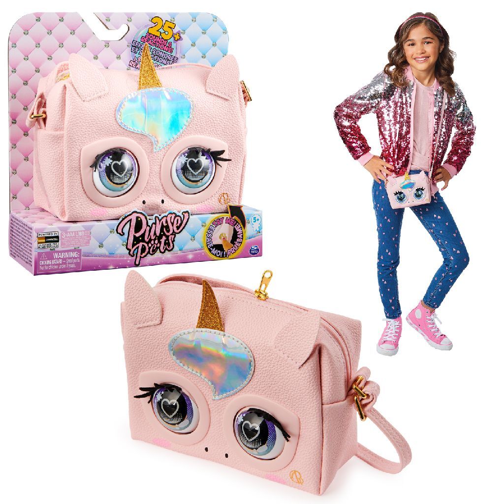 DePurse Pets Interactieve Eenhoorn Tas heeft een glitterhoorn, regenboogkleurig lakleer, roze gekorreld kunstleer, popart-achtige ogen, een verstelbare schouderriem en rits-sluiting. Terwijl je onderweg bent, knippert je Purse Pet Eenhoornmet haar ogen en communiceert ze met je door uitbundige geluidjes te maken. Raak haar voorhoofd aan om haar vrolijk te laten kirren en snorren. Maak een selfie, aai en houd haar voorhoofd vast. Ze zal dan haar ogen sluiten, weer openen en een kusje naar je blazen. In de magische modus kun je spelletjes doen met muziek erbij. Je kunt ook aan je Purse Pet Eenhoornvragen of ze je outfit mooi vindt. Raak haar voorhoofd aan, stel je vraag en ze reageert met schattige geluiden en een ja of nee. Stel haar meer vragen en laat je swingende catwalk-look zien. Je Purse Pet InteractieveEenhoornlaat modeshowmuziek horen. Tik op haar voorhoofd voor geluiden van klikkende camera's en houd het vast voor applaus. Wordt inclusief 3 AAA-batterijen geleverd. Geschikt voor kinderen vanaf 5 jaar.