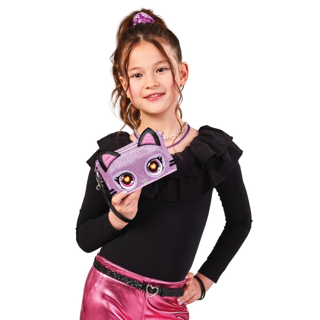 - Purdy Purrfect is gemaakt van glad paars glittermateriaal, metallic paars met zwarte kattenoortjes, op popart geïnspireerde ogen en een metalen lipje aan de rits. Klik het 33 cm lange riempje aan het uiteinde van de tas om je nieuwe Purse Pets-BFF om je pols te dragen of klik het riempje aan het andere uiteinde van de tas om Purdy Purrfect als schattige handtas te dragen.
