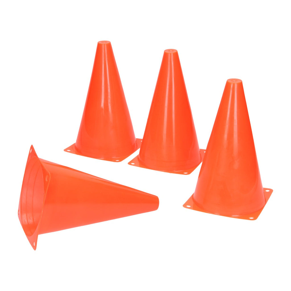 Set van 4 oranje pylonen, gemaakt van stevig kunststof. Handig om te gebruiken voor bijvoorbeeld sport- en spelactiviteiten.