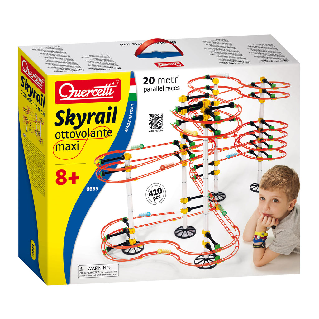 De Quercetti Skyrail 'Ottovolante Maxi' knikkerbaan is een zeer uitgebreide set, bestaande uit maar liefst 410 onderdelen. Een achtbaan met een maximale lengte van wel 20 meter. Deze knikkerbaan is zorgvuldig ontworpen. Door het gebruik van verschillende maten knikkers en materialen zullen kinderen interessante observaties, experimenten en ontdekkingen doen in de wereld van de fysica (snelheid, zwaartekracht, wrijving). Dit alles maakt het een knikkerbaan van uitzonderlijke en unieke educatieve waarde die garant staat voor uren speelplezier. Inclusief knikkers en een instructieboekje. Inclusief knikkers. Geschikt voor kinderen vanaf 8 jaar.