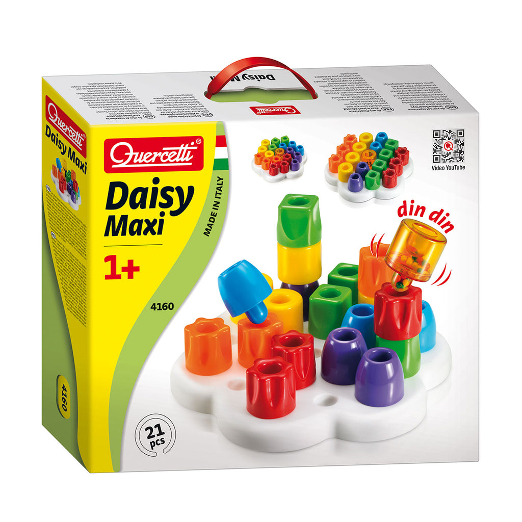 Deze Quercetti Daisy Maxi set is ideaal voor jonge kinderen. Kinderen stapelen met plezier deze 20 grote pinnen op elkaar. En laten ze weer omvallen... Oudere kinderen kunnen de pinnen sorteren per kleur of vorm, ze vastknopen, tellen, patronen mee maken en 3D structuren mee bouwen. De pinnen zijn gemaakt van kunststof en het bord is gemaakt van flexibele rubberplastic. Onbreekbaar, wasbaar en plezierig om vast te pakken. Compatibel met 4150 Geokid Tris. Geschikt voor kinderen vanaf 1 jaar.