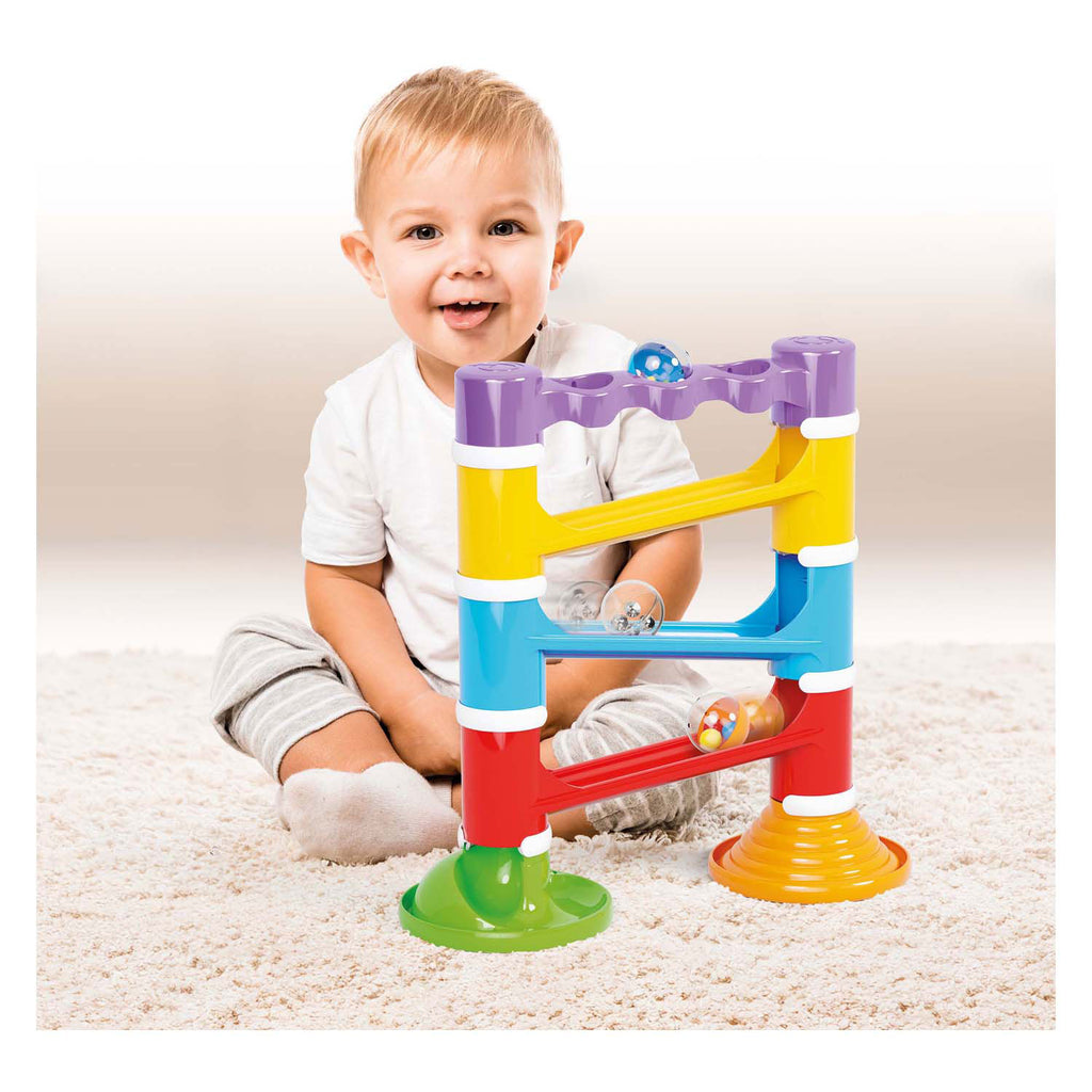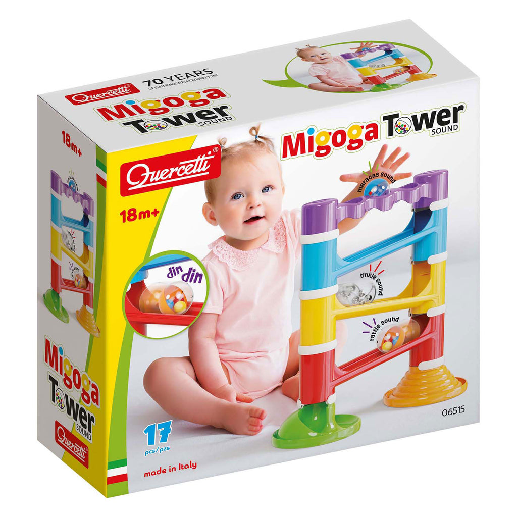 De Quercetti Migoga Knikkerbaan Toren met Geluid, 17 onderdelen, biedt eindeloos plezier met 3 ballen met geluid. Deze set bevat een meervoudige start, rechte banen, connectors en een finish, waarmee kinderen hun eigen baan kunnen bouwen. Duw de ballen en luister naar het grappige geluid terwijl ze de baan afrollen. Ideaal voor het ontwikkelen van motorische vaardigheden en creatief denken. Geschikt voor kinderen vanaf 4 jaar.