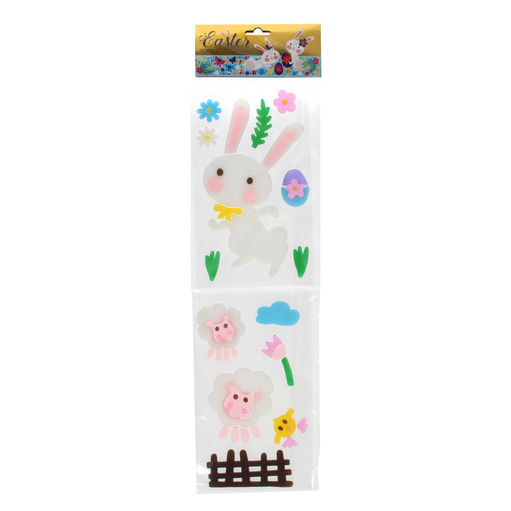 Herbruikbare raamstickers van gel in paas- en lentethema. Afmeting: 57 x 16 centimeter. Niet geschikt voor kinderen onder de 3 jaar oud.
