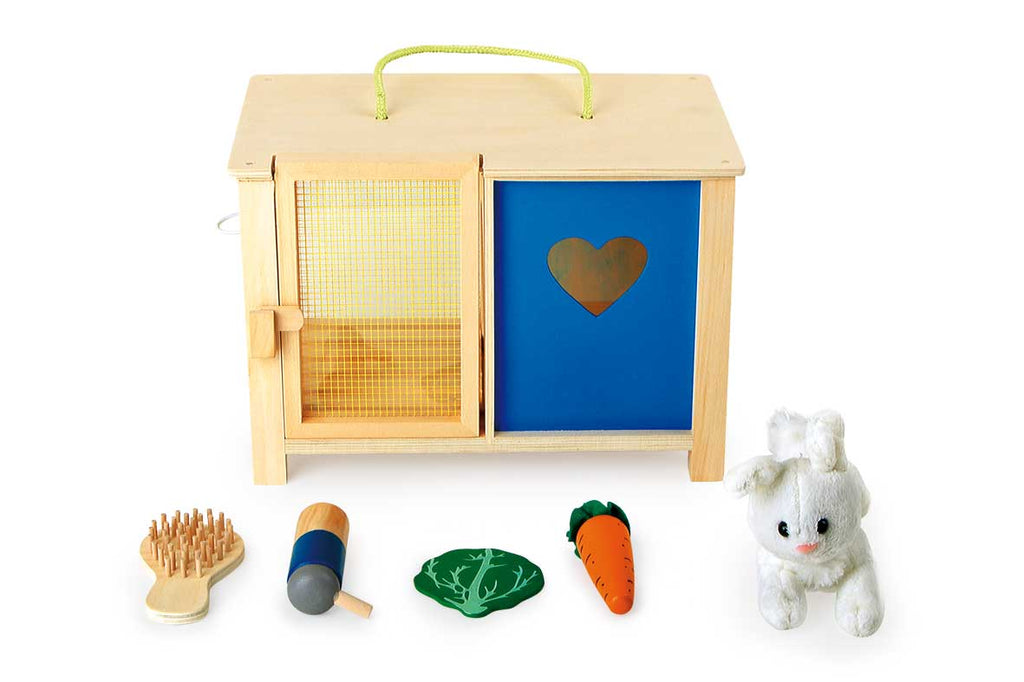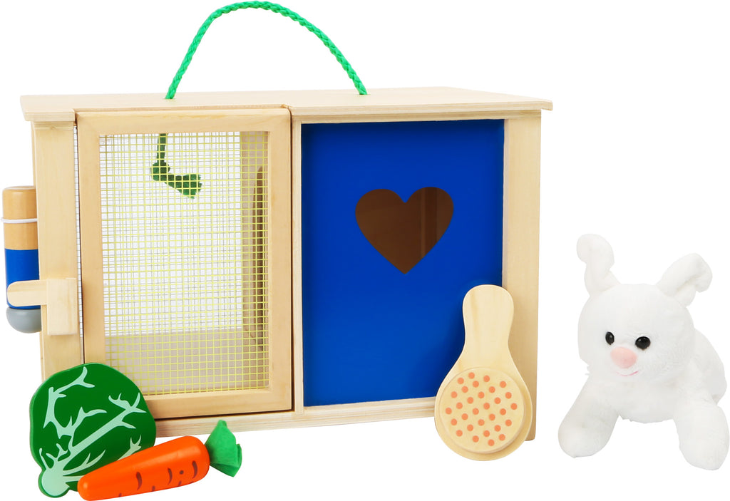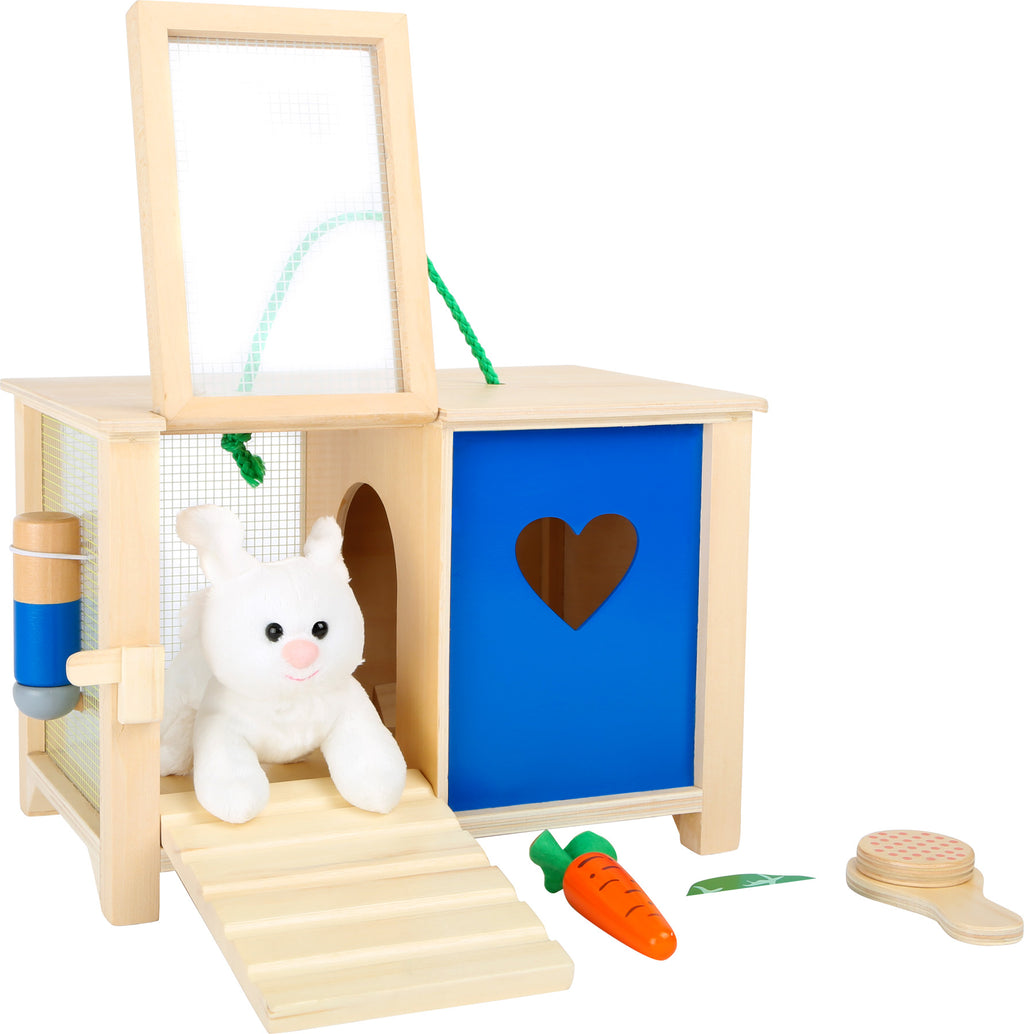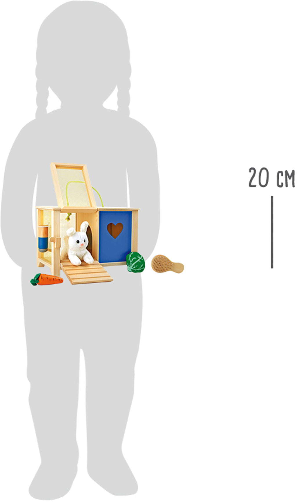 Hier leren kinderen verantwoordelijkheid te nemen voor hun huisdieren! Dit leuke hok met accessoires is gemaakt van massief en gelamineerd hout. Via een klep kunnen kinderen in het hok komen om het schattige konijntje te voeren, te borstelen en zijn drinkwater bij te vullen. Een kleine oprijplaat helpt het langorige konijntje in en uit te stappen. Inclusief konijn, wortel, slablaadje, borstel en waterflesje.