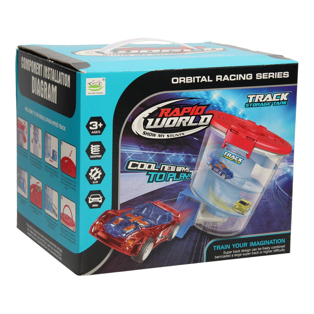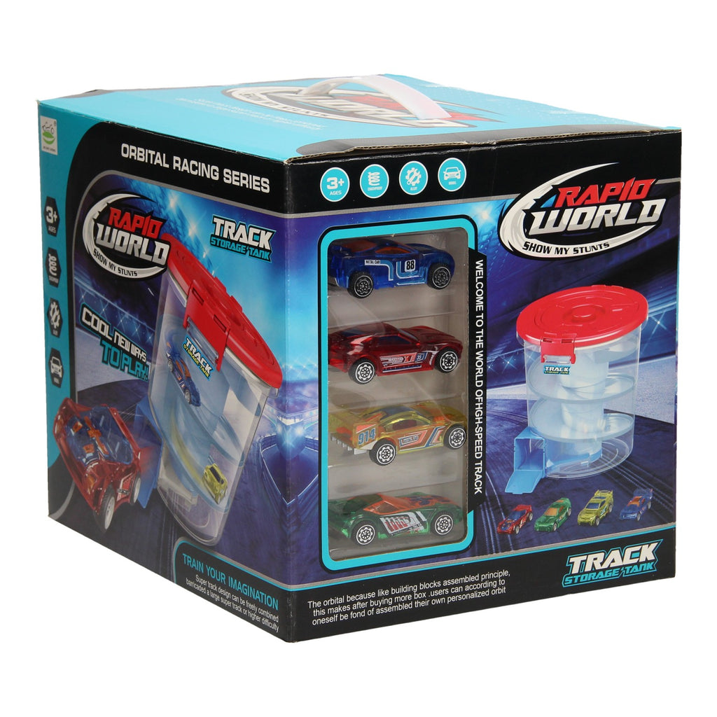 Racebaan en Opbergbox Auto's 2in1. In de set zitten vier verschillend gekleurde raceauto's, een opbergbox/racebaan en een stickervel om de racebaan te versieren. Geschikt vanaf 3 jaar.