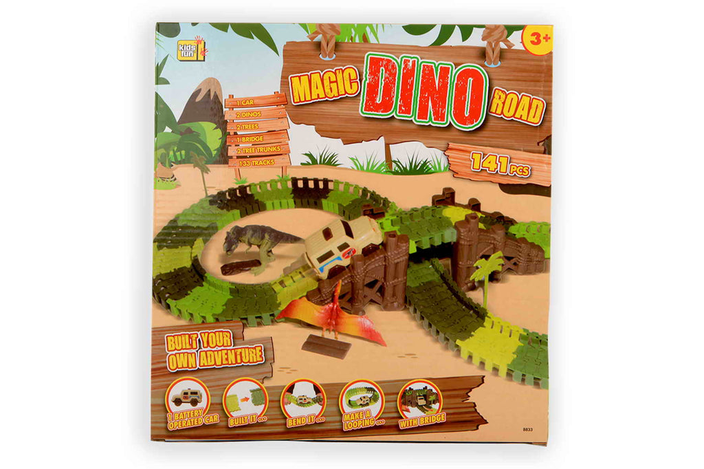 Met deze set hebben jouw kinderen eindeloos speelplezier. Maak je eigen route door de jungle met de flexibele baanstukken, maar pas op voor de dino's! Exclusief batterijen