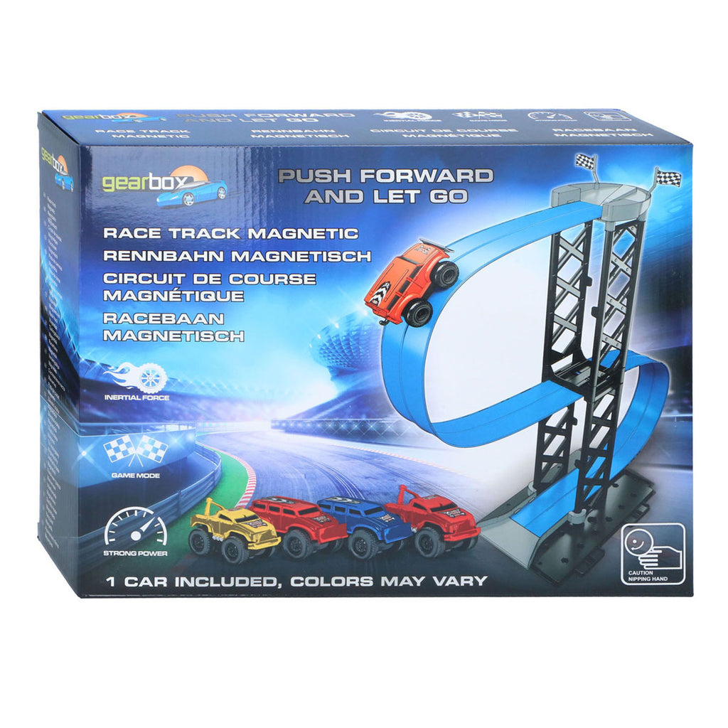 Magnetische racebaan met 12 onderdelen, waaronder 1 auto. Duwen, loslaten en de magnetische racebaan houdt de auto vast op de baan. De verticale racebaan kan de auto ondersteboven laten rijden. Niet geschikt voor kinderen onder de 3 jaar oud.