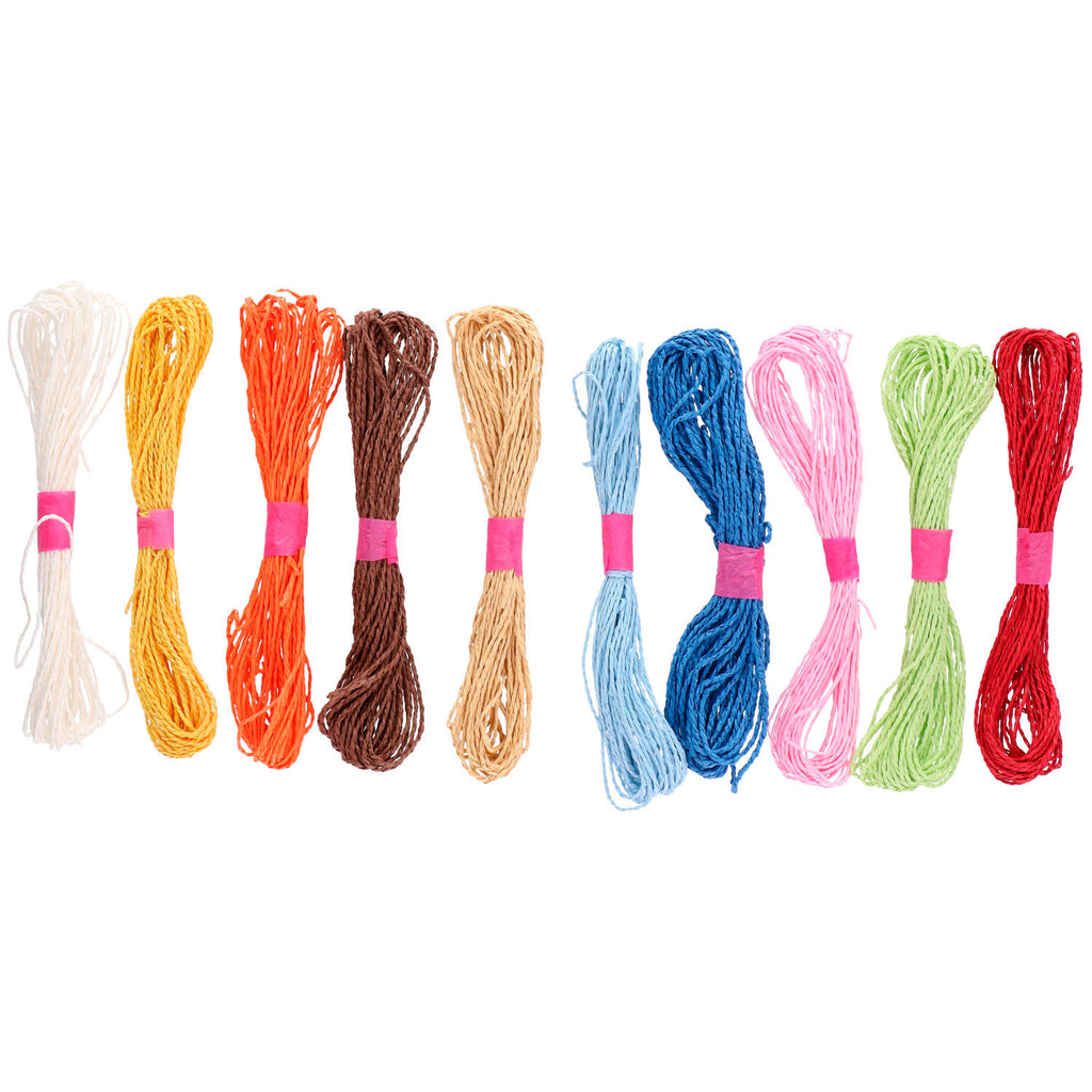 Gebruik dit vrolijk gekleurde raffiadraad voor verschillende knutselwerkjes. In het zakje zitten 5 verschillende kleuren raffiadraad van 12 meter.