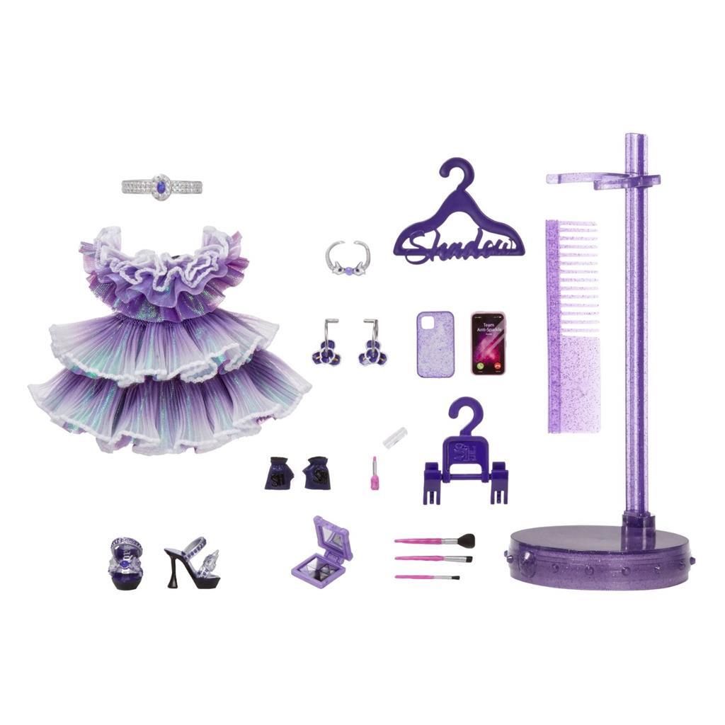 Rainbow High Shadow High Monique Verbenais van top tot teen gekleed in paars, sprankelend wit en zilver.Ze drukt haar eigen stijl uit in een prachtige paarse gelaagde organza-jurk, diamanten edelsteenriem, paarse sandalen, handschoenen en leuke accessoires.En ze heeft prachtig paars lang gevlochten haar in twee paardenstaarten, lange echte wimpers en glazen ogen.Omdat ze volledig beweegbaar is, is ze gemakkelijk en leuk om mee te spelen.Haar hoofd, armen, handen en benen buigen voor zoveel leuke houdingen, inclusief de spagaat!Of je kunt haar tentoonstellen op de meegeleverde poppenstandaard.