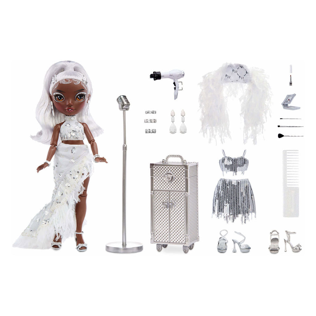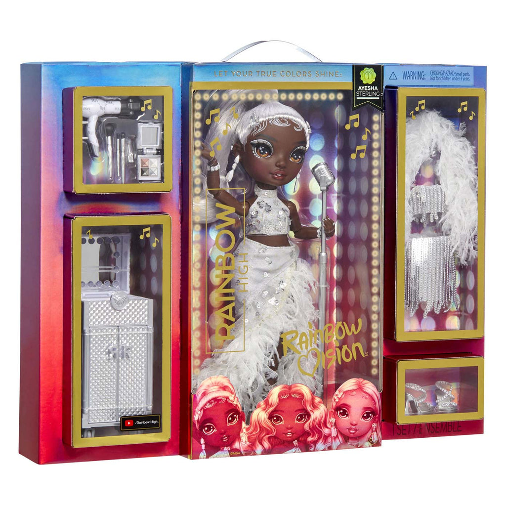 De allerbeste kunstopleidingen vaardigen bands af om deel te nemen aan de wereldberoemde Rainbow Vision-muziekwedstrijd. Elke speelset is inclusief een modepop, 2 designeroutfits om te mixen en matchen en een microfoon plus kaptafelset, zodat elk kind plezier kan beleven. Ayesha Sterling heeft een uniek ontwerp en is van top tot teen gekleed in zilveren en witte tinten. Haar mode is voorzien van schitterende details en ze heeft prachtig, krullend, zilverkleurig haar, lange echte wimpers en glazen ogen. Geschikt voor kinderen vanaf 6 jaar.