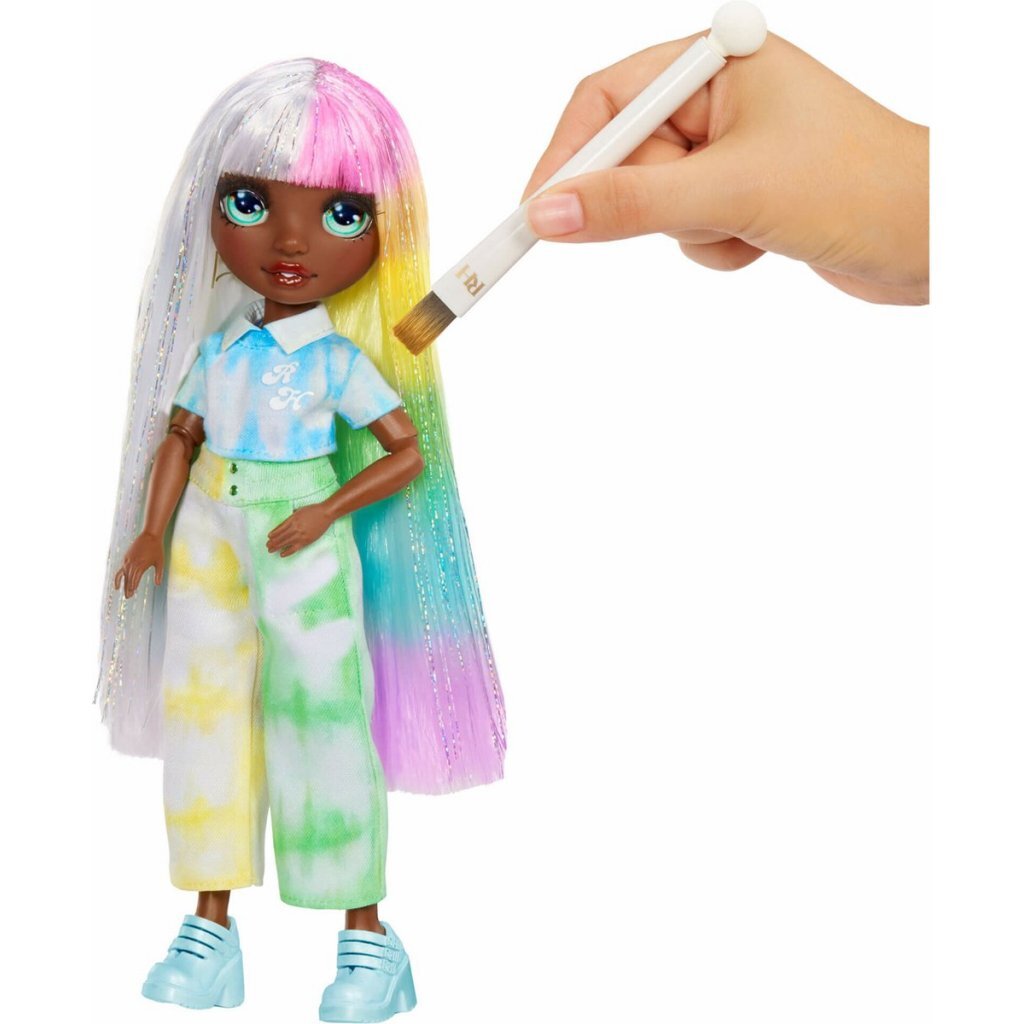 - Voeg water toe aan de 6 poeders in regenboogkleuren om waterverf te maken. Doop daarna de kleding en het haar erin. Met 6 kleuren (roze, oranje, geel, groen, blauw en paars) om allerlei kleurrijke ontwerpen te maken. Het is zo makkelijk!
