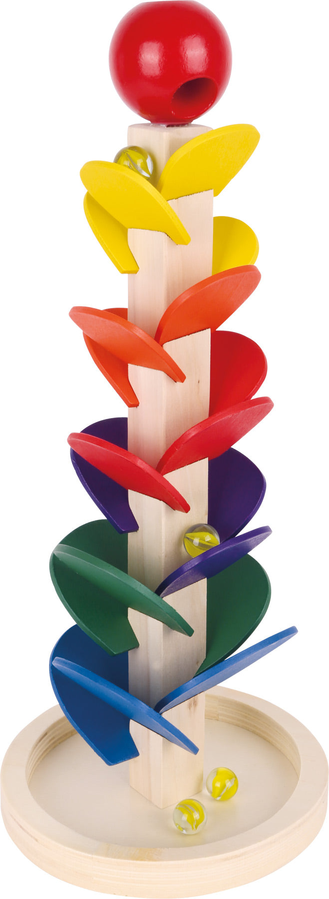 Kijk en luister - deze knikkerbaan is een echte geluidservaring! Zodra de glazen knikker in de rode houten bal is gestoken, begint het zijn weg te vinden van hogere tonen naar lagere tonen van het onderste gedeelte. Plus: de frisse, complementaire regenboogkleuren maken van deze akoestische knikkerbaan een decoratieve eyecatcher in de kinderkamer!