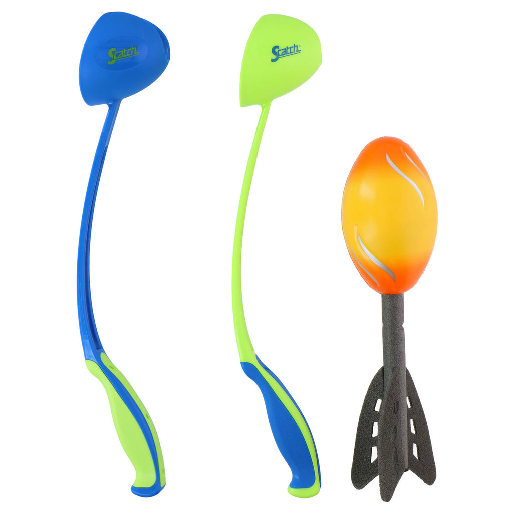 Raketbal lanceerspel met twee werpers en één raketbal. Klem de raketbal in één van de werpers en maak een zwaaiende beweging naar voren zodat de raketbal uit de werper vliegt. Wie de raketbal het verst schiet, heeft gewonnen. Speel het spel alleen of samen.