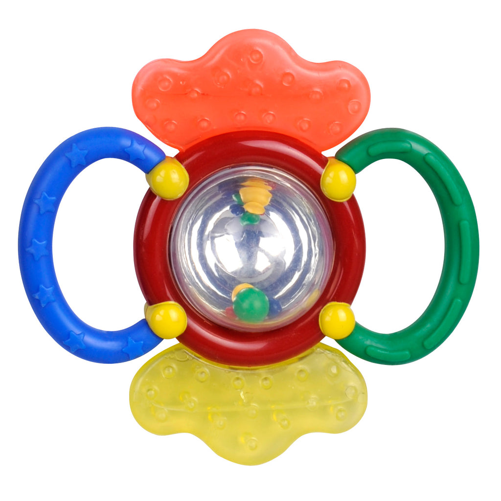 Veelzijdige rammelaar voor baby's vanaf 3 maanden. Rammelaar, spiegel, bijtstukjes van 2 verschillende materialen.