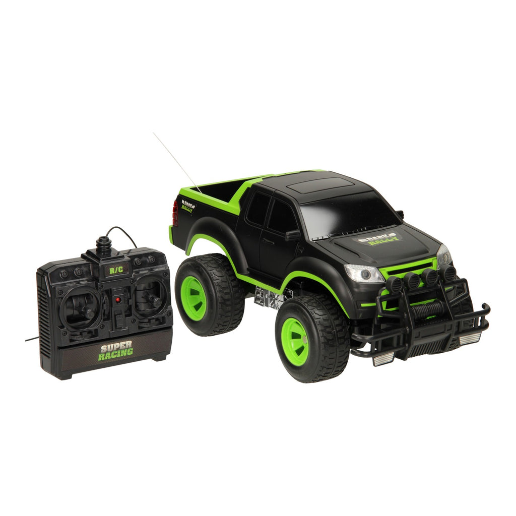 Matzwarte RC Bestuurbare Rallywagen met groene accenten en twee lichtgevende koplampen. Met de console kun je de terreinwagen flink laten rondracen op je zelf bedachte parcour. De bestuurbare terreinwagen werkt op 6 AA batterijen en de console werkt op 1 9V batterij (batterijen zijn niet inbegrepen).