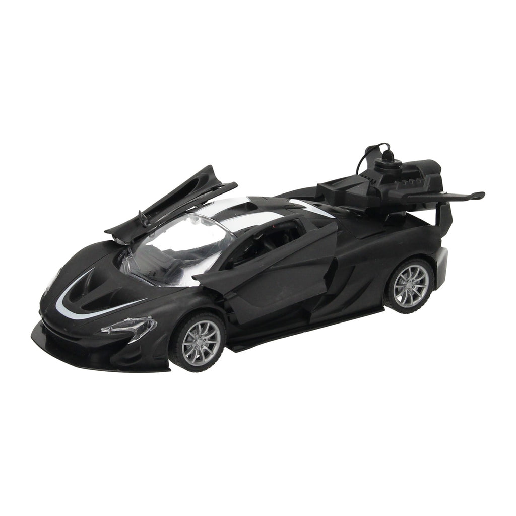 Zwarte RC sportwagen met vleugeldeuren en stoomfunctie. De auto is 22,5 x 10,5 x 8 centimeter groot en geschikt voor kinderen vanaf 6 jaar.