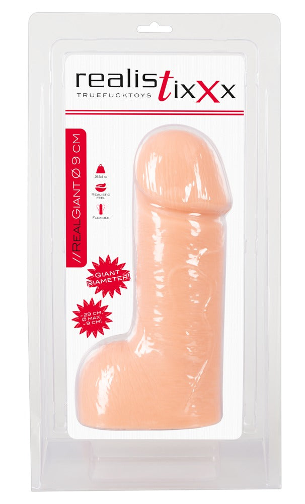 Massive, yet flexible realistic dildo Real Giant from Realistixxx in a penis look with slight veins and a bulging glans. The large testicles also serve as a base. The Giant weighs more than 2 kg and sits securely on any smooth surface so it can also be enjoyed hands-free.