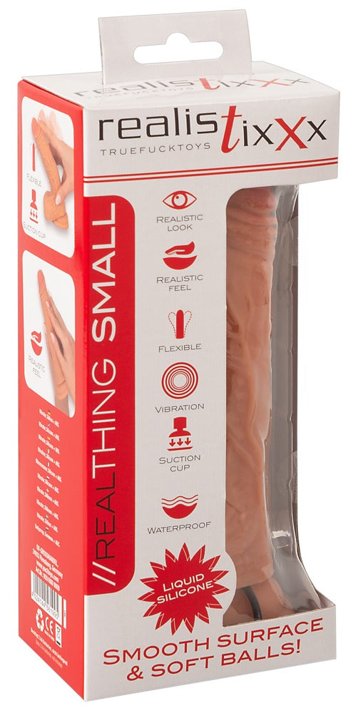 Deze mollige natuurlijke jongen Real Thing Small van Realistixxx maakt niet alleen indruk met zijn realistische ontwerp, dat is voorzien van uitgesproken adering en eikel, evenals een paar ronde testikels. Zijn beweeglijkheid en de 3 verschillende vibratiestanden, waartussen gemakkelijk kan worden geschakeld met de bedrade afstandsbediening, maken hem ook tot een flexibele minnaar. Hij is gemaakt van uiterst zachte siliconen, die heerlijk glad en comfortabel aanvoelen. Dankzij de zuignap kan hij stevig worden bevestigd op gladde oppervlakken, zodat u uw handen vrij hebt. Gelieve batterijen afzonderlijk te bestellen: 2 x AA.