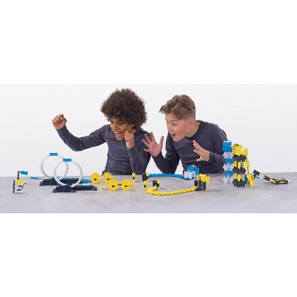 Sensationeel nieuws uit de wereld van Domino-Express: ReaXion met de spectaculaire X-tile en LinX stenen! Deze dominostenen vallen niet alleen om, maar je ontwerpt en bouwt er ook fantastische bouwwerken en stunts mee. Met ReaXion Xtreme Race bouw je met X-tiles, LinX, Loopings en Ziplines twee circuits en racet tegen elkaar. Wie ontwerpt het spectaculairste en snelste circuit? Verbaas iedereen met een spectaculaire race en laat als klap op de vuurpijl een tile langs de Zipline glijden om de keten verderop te laten exploderen!