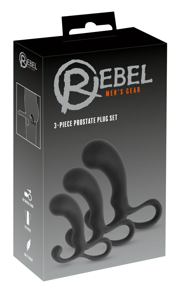 3-Piece Prostate Plug Set from Rebel that includes 3 butt plugs with different sizes and weights for spot-on prostate stimulation. They are also perfectly suitable for stretching and training. Each plug has an ergonomic shape with a bulging P-spot tip, a curved perineum stimulator and a practical finger loop that also functions as a stopper. Sizes: