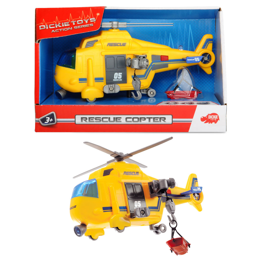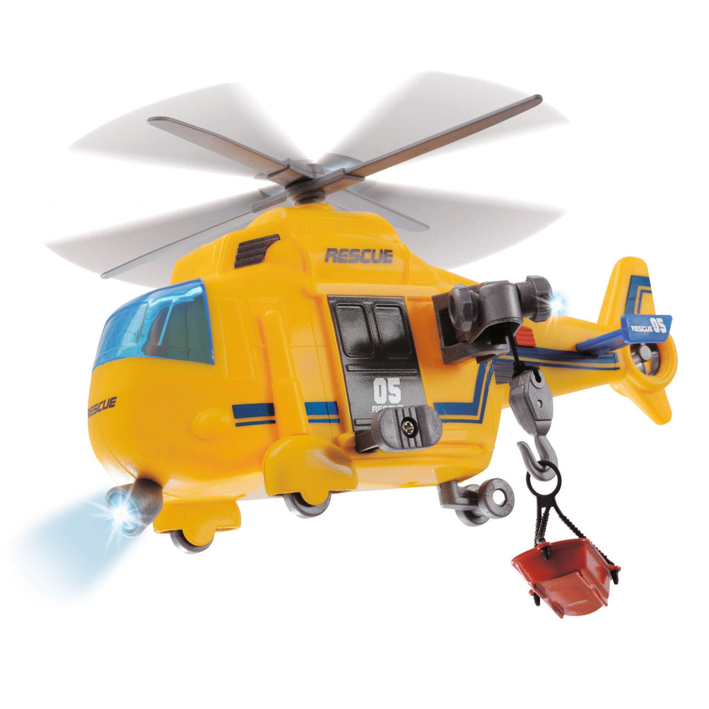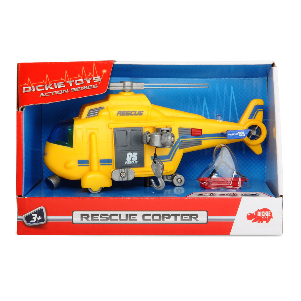 Met deze reddingshelikopter van Dickie Toys worden reddingsoperaties nog makkelijker. Maak de reddingskooi vast aan de takel haak en laat hem naar boven en beneden gaan. Druk op de rode knop bij de staart en de helikopter geeft licht en maakt geluid.