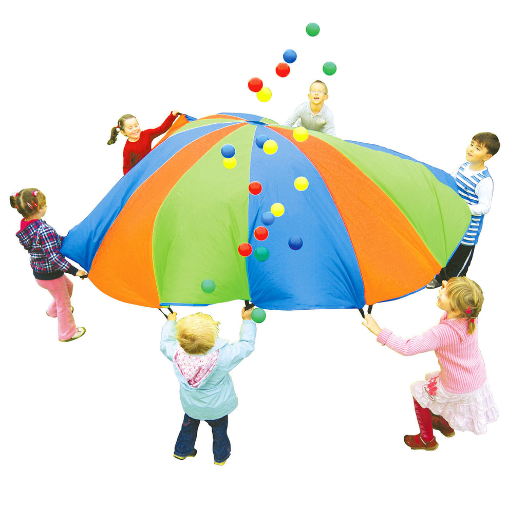 De parachute is een ideaal om kinderen spelenderwijs te leren samenwerken. De afmeting van de parachute is 305 cm en heeft 12 handvatten. Inclusief 24 gekleurde ballen.