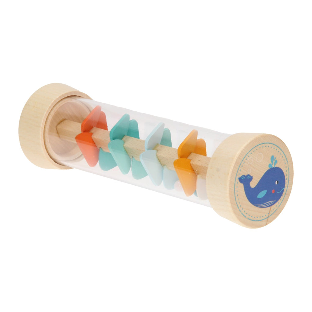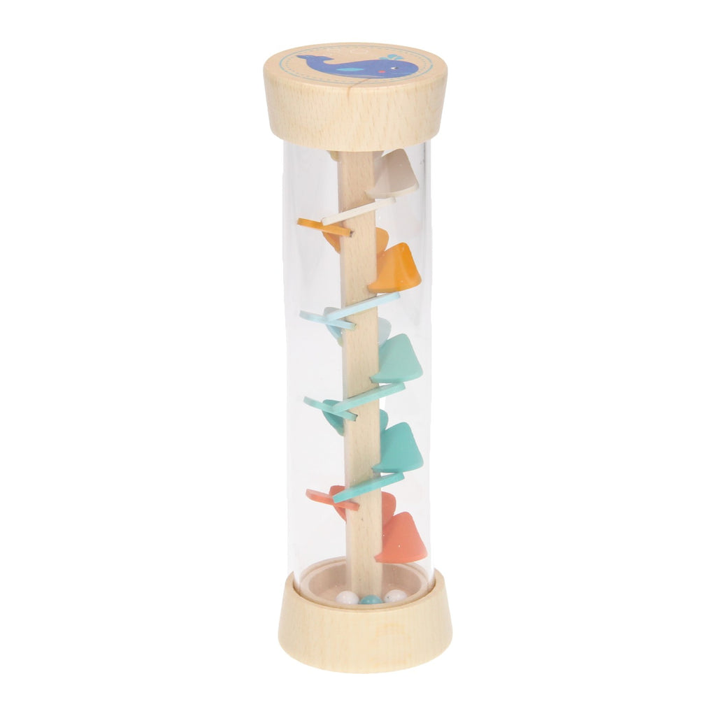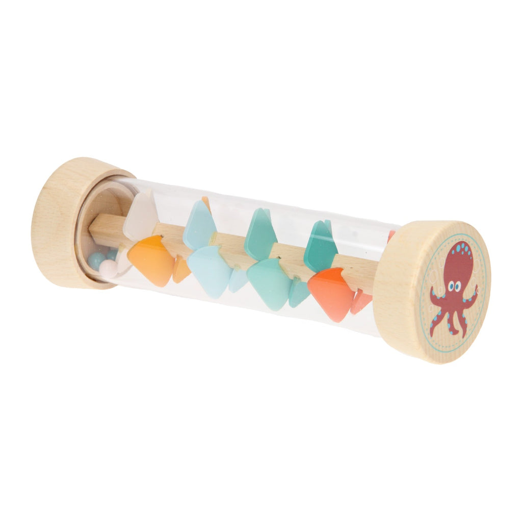 Regenmaker van hout. De uiteinden en binnengedeelte zijn gemaakt van hout, de balletjes en het tussenstuk van doorzichtig kunststof. Geschikt vanaf 12 maanden.
