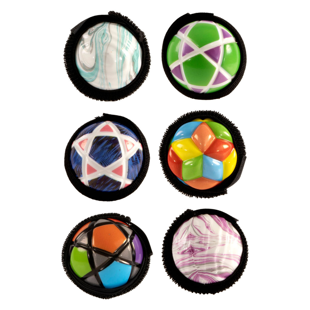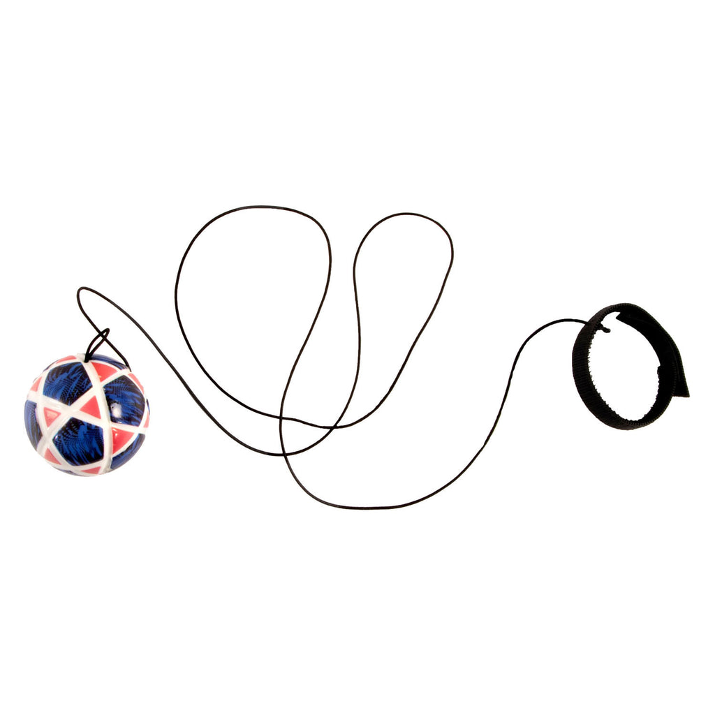 Polsbal. Maak het klittenband vast aan je pols en trap of gooi het balletje weg. Door het elastiek komt de bal direct weer terug naar je! Afmeting: diameter 6 centimeter.