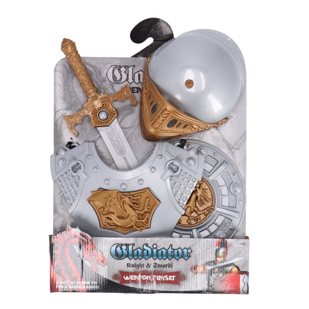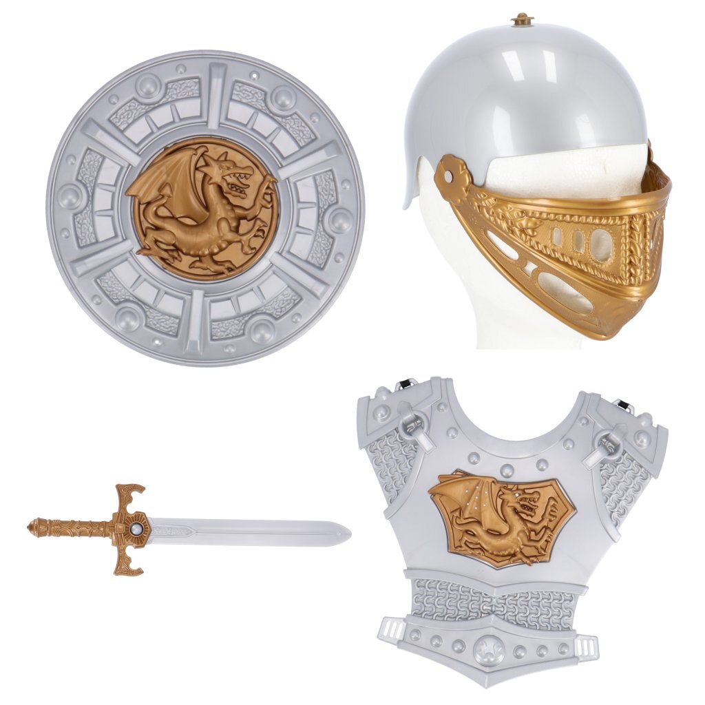 Ridder verkleedset met helm, borstplaat, zwaard en schild. Ga de strijd aan met de gevaarlijke draak en red de prinses. Geschikt voor kinderen vanaf 5 jaar.