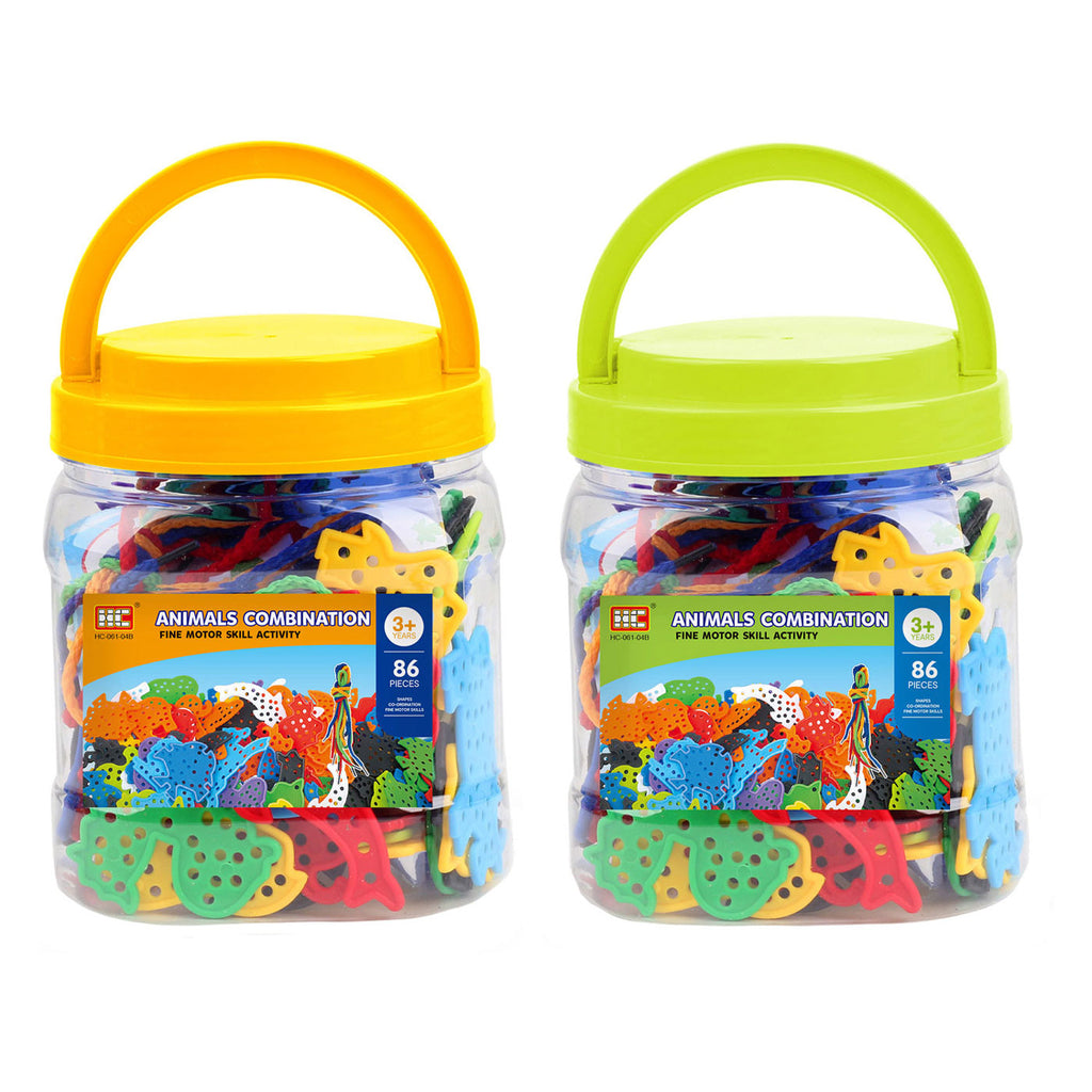 Kunststof opbergbox met 86-onderdelen, rijgdieren en rijgdraad. Inclusief boekje met voorbeelden. Geschikt vanaf 3 jaar.