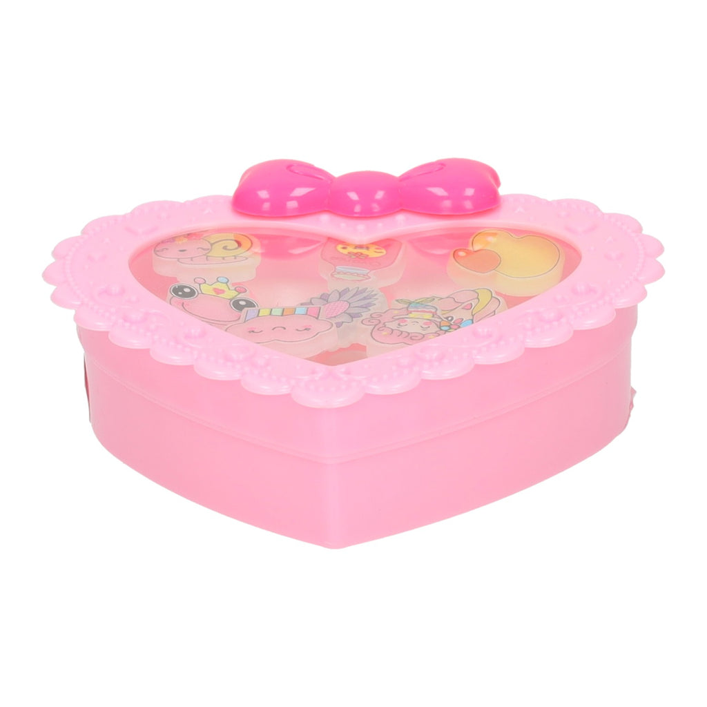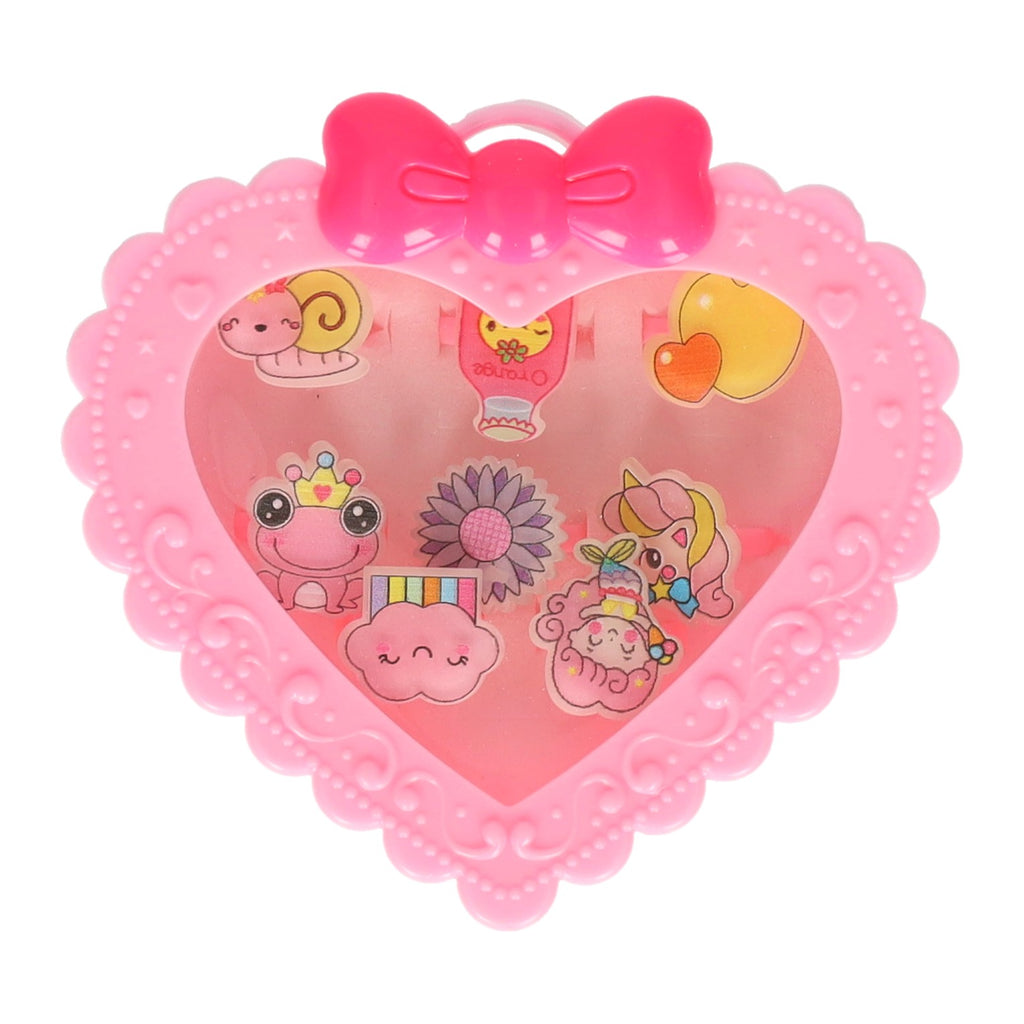 Doosje in de vorm van een hart met 8 ringetjes. Elk ringetje heeft een ander steentje in de vorm van een regenboog en eenhoorn.