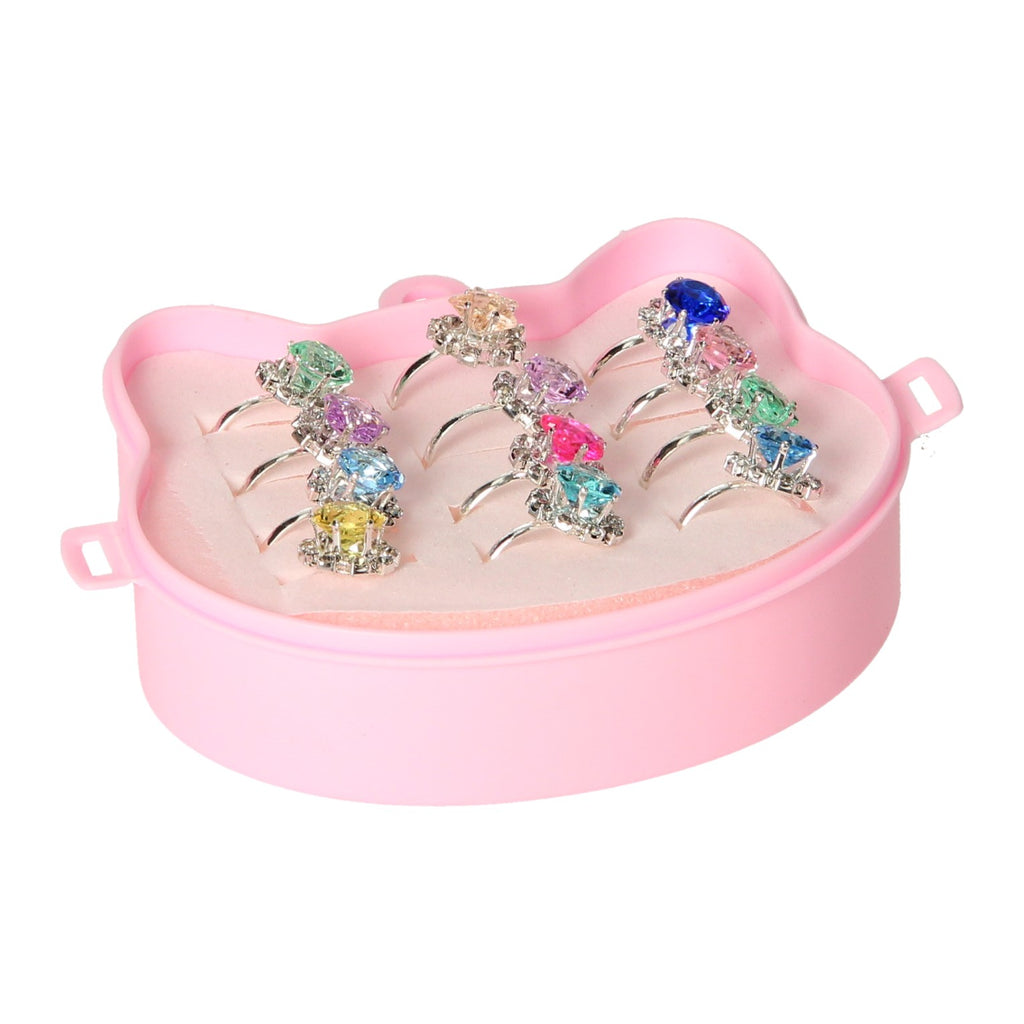 Ringenset die 12 zilverkleurige kinderringen bevat. Elke ring heeft een ander gekleurd steentje. De ringen zijn geschikt voor kinderen vanaf 6 jaar. De gemiddelde diameter is 15 mm, maar de ringen zijn verstelbaar.