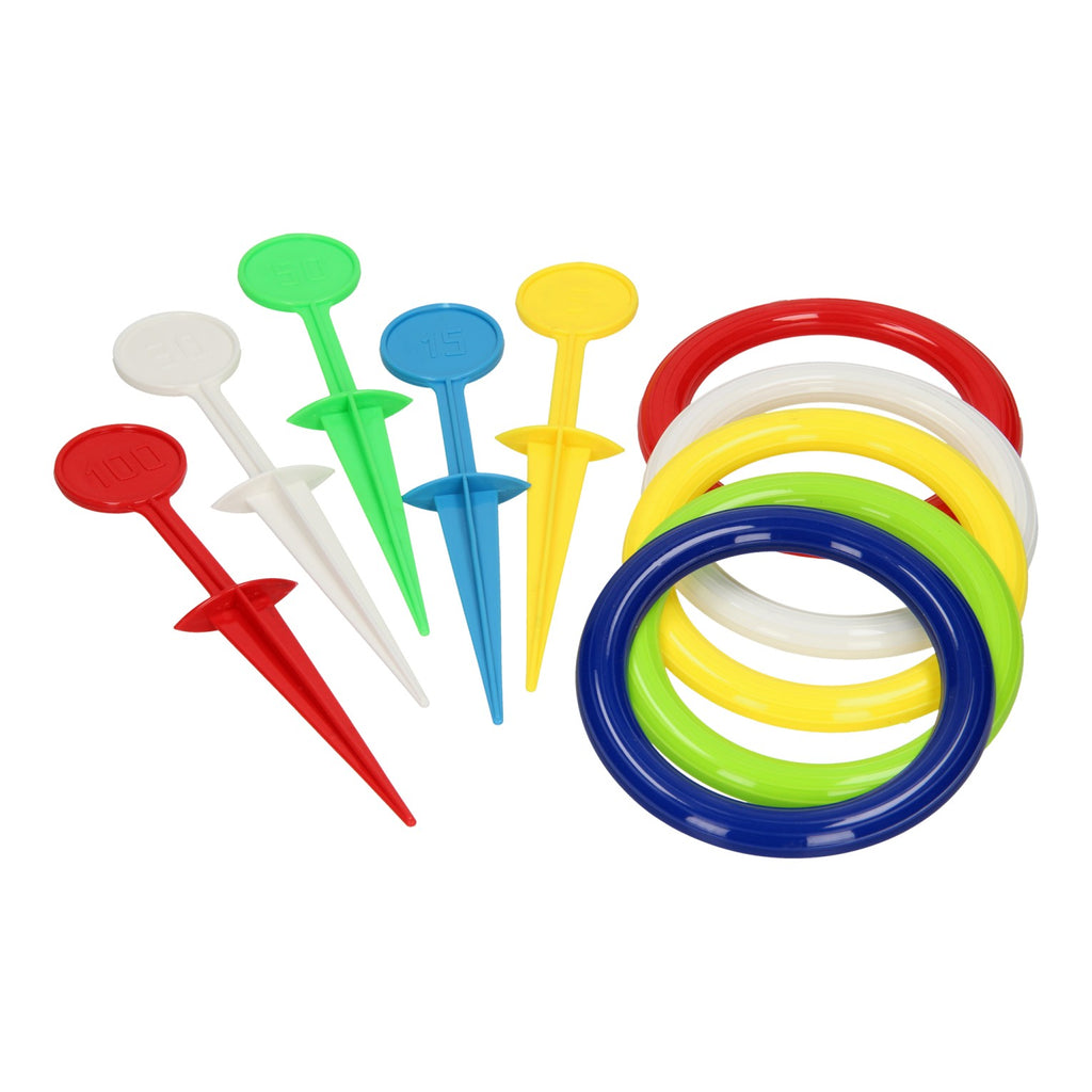 Werp de ringen rond de paaltjes en scoor de meeste punten. Steek de paaltjes in de grond en het spel kan beginnen. De paaltjes hebben verschillende puntenscores, dus voor de meeste punten moet je op rood mikken! Een uitdagend behendigheidsspel voor jong en oud. Het enige wat je nodig hebt is een grasveldje. Wie daag jij uit? De paaltjes hebben een hoogte van 24 centimeter. De ringen hebben een doorsnede van 14 centimeter.
