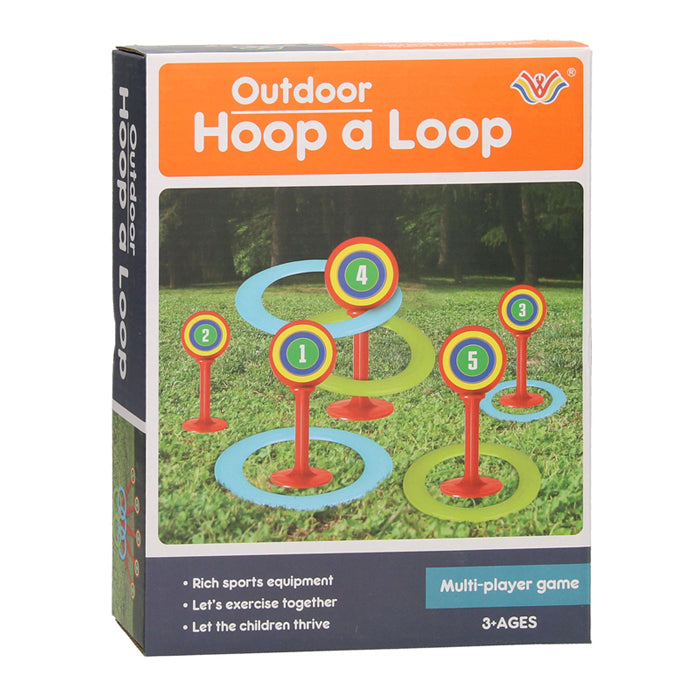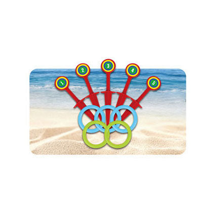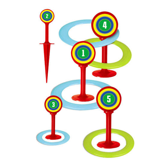 Ringwerpspel met 5 puntenpaaltjes en 5 ringen (3 blauwe en 2 groene). Gooi de ring over de paaltjes en scoor de meeste punten. Geschikt voor kinderen vanaf 3 jaar oud.
