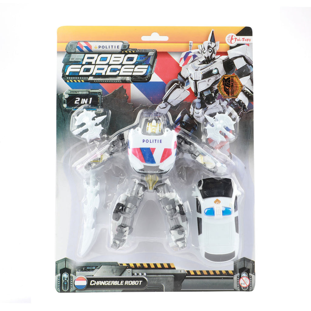 Deze ROBOFORCES robot zier er uit als een stoere politiehulp, klaar voor alle slechteriken. En hij heeft een extra handigheidje om iedereen te slim af te zijn: met een paar handelingen verander je hem zomaar in een politieauto! Zo kan hij supersnel achter alle boeven aan... Wees gewaarschuwd!