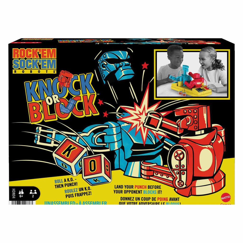 In de Rock 'Em Sock 'Em Robots™ game regent het al knock-outs sinds 1964, maar in deze versie gaat het net even anders: een dobbelsteen bepaalt wie er knokt en wie er blokt! Rode Rocker en Blauwe Bom hebben zoals altijd hun vuisten klaar om de blokkering van hun tegenstander te breken. Met de joysticks op de ring kunnen spelers handmatig alle slagen en hoeken regelen. Maar in deze versie bepaalt de dobbelsteen welke robot defensief gaat boksen en op de knop BLOKKEN slaat, terwijl de ander in de aanval gaat en op de knop KNOKKEN slaat! Het doel blijft hetzelfde -- breek dwars door zijn blokkade! Een geweldig cadeau voor kinderen vanaf 6 jaar. Kleuren en versieringen kunnen variëren.