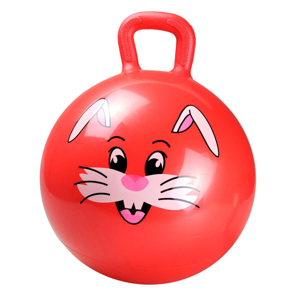 Rode skippybal met dierenprint. Deze skippybal is van een kleiner formaat en daardoor geschikt voor kinderen van ongeveer 3 jaar.