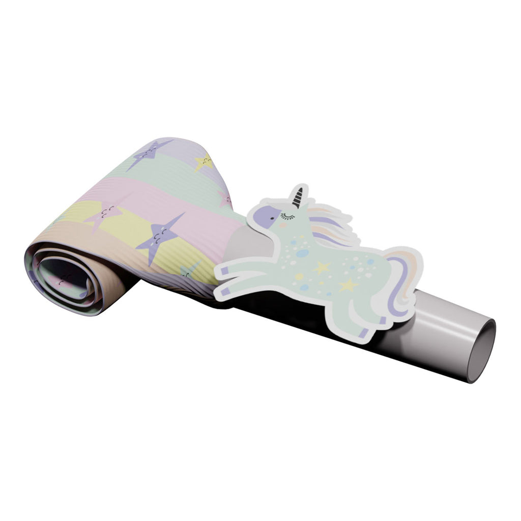 Roltongen Unicorns & Rainbows 24cm - 6 stuks. De roltongen zijn 24x4 cm groot. Gemaakt van papier en plastic.