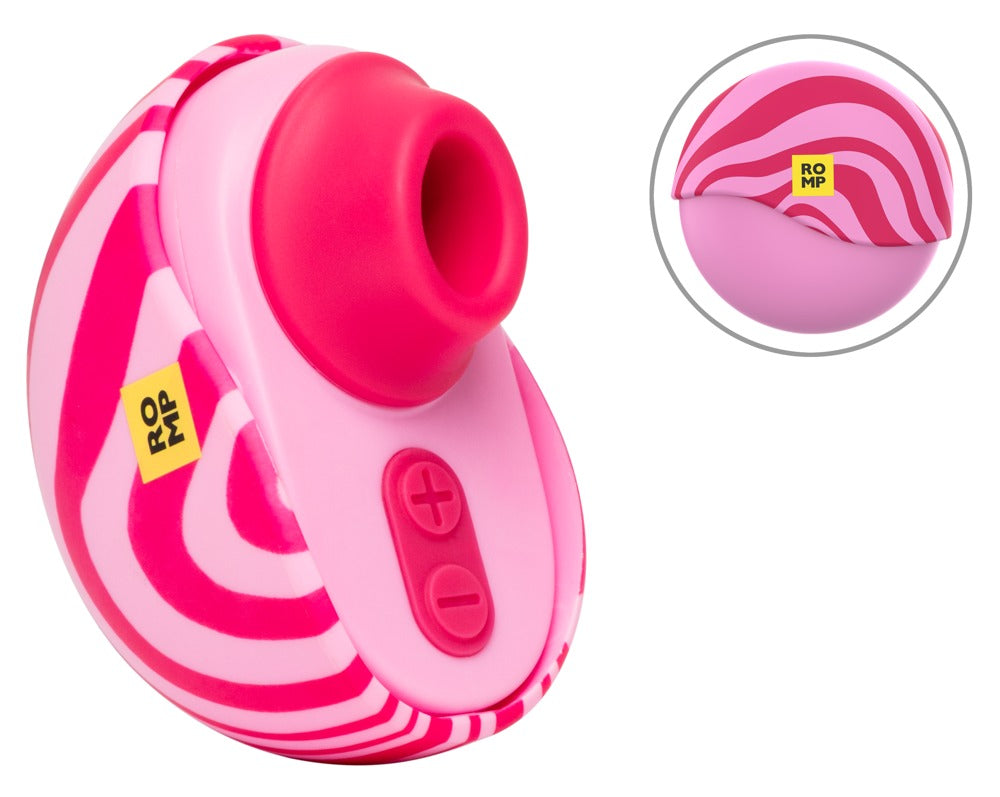 The small and compact clitoral stimulator, Spin from ROMP, has Pleasure Air technology in its velvety soft silicone head. The pulsating air vibrations stimulate the clitoris (completely contact-free) in 3 modes and 10 intensities for mind-blowing climaxes at the push of a button.
